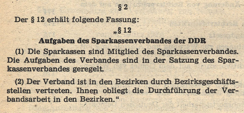 ** Vgl. Bekanntmachung über die Änderung des Statuts der Sparkassen der Deutschen Demokratischen Republik vom 8. März 1990, § 1, in: Gesetzblatt der DDR, Teil I, Nr. 19, 23.03.1990, S. 174; Bestand: Historisches Archiv des OSV