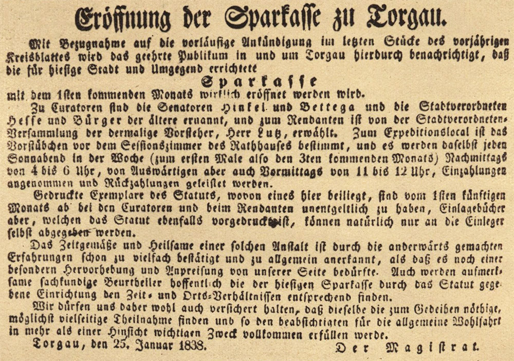 • Ende Januar 1838 wurde die Eröffnung der Sparkasse in der Presse angekündigt. (Abb. in 100 Jahre Torgauer Sparkasse, Festausgabe der Stadt- und Kreissparkasse Torgau zum 3. Februar 1838, S. 6; Bestand: Historisches Archiv des OSV)