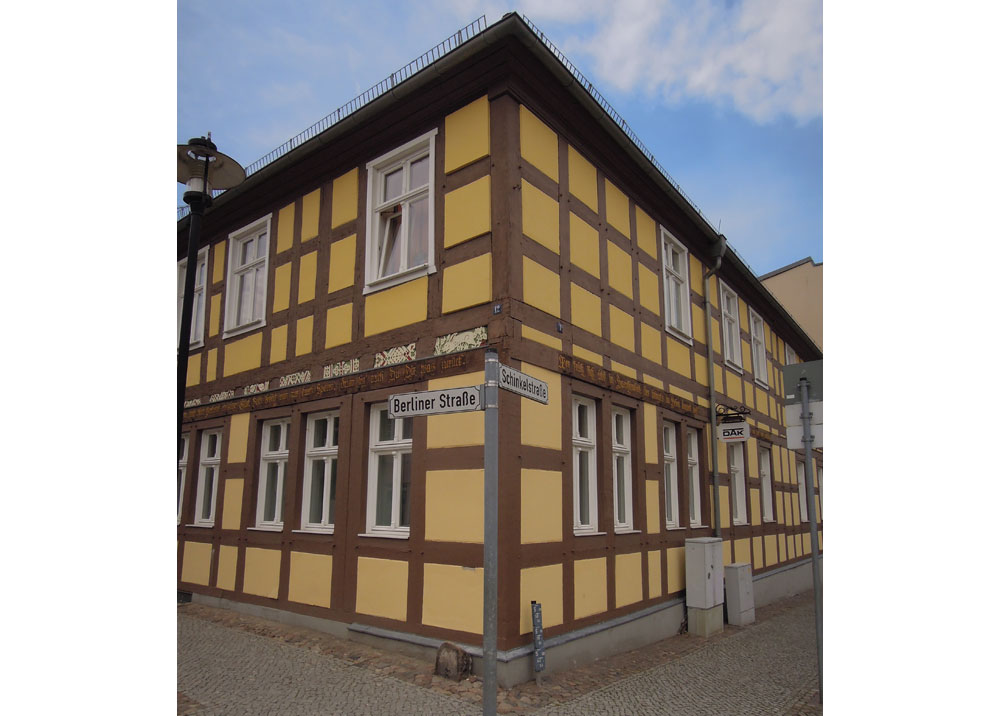 An Balken des Eckhauses Berliner Straße/ Schinkelstraße sind nämlich heute (noch) in goldenen Lettern Sinnsprüche zum Thema Sparen zu lesen, zum Beispiel „Wer früh sich übt in Sparsamkeit, der bringt’s im Leben doppelt weit!“. Die kommunale Kreissparkasse, ab 1858 Nachfolgeinstitut der Sparkasse für den Kreis Templin, hatte ab 1941 ihren Sitz in dem Fachwerkhaus. Damals war Sparen allerdings nicht wie heute ein individuelles, freiwilliges Vorsorgen für die eigene Zukunft, sondern Kriegspflicht. Der NS-Staat nutzte die Einlagen der Sparkassen zur Kriegsfinanzierung. Die Werbung für das Sparen war oft ideologisch geprägt. Die Sprüche am ehemaligen Sparkassengebäude in Templin fallen allerdings nicht in diese Kategorie.