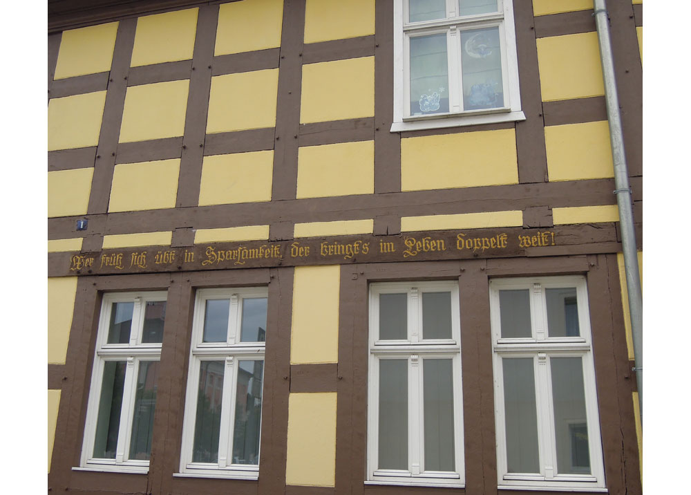 Gleich am Markt steht das frühere Sparkassengebäude. Verschiedene Sinnsprüche zum Sparen sind an ihm zu entdecken. : © Thomas Einert, 2015