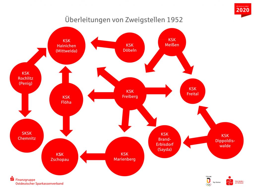 • Nach der Auswertung der Überleitungsberichte ergab sich für die Vorgängerinstitute der Sparkasse Mittelsachsen (Rochlitz, Hainichen, Flöha, Freiberg, Brand-Erbisdorf) dieses Bild. Die Kreissparkasse Freiberg wurde infolge der Verwaltungsreform zergliedert. : © Historisches Archiv des OSV