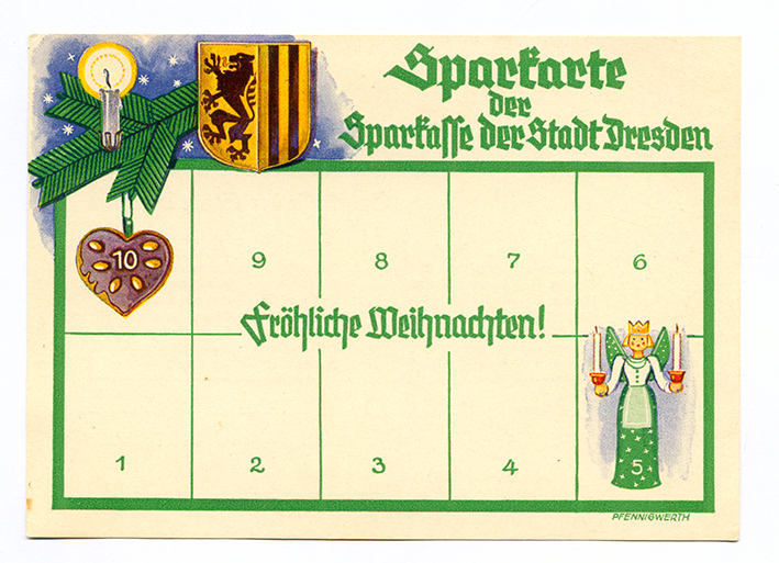Viele städtische Sparkassen förderten ab dem ausgehenden 19. Jahrhundert den Kleinspargedanken und trugen damit zur Sparerziehung bei. Schön gestaltete Sparkarten, wie diese hier aus Dresden, sprachen besonders Kinder und Jugendliche an. Konnten sie regelmäßig einen bestimmten Betrag – zuerst 10 Pfennige, später oft auch 50 Pfennige – erübrigen, war die Karte oder auch ein kleines Heft schnell bis aufs letzte Feld beklebt mit Sparmarken. Die Gutschrift auf ein Sparbuch erfolgte anschließend bei der örtlichen Sparkasse.