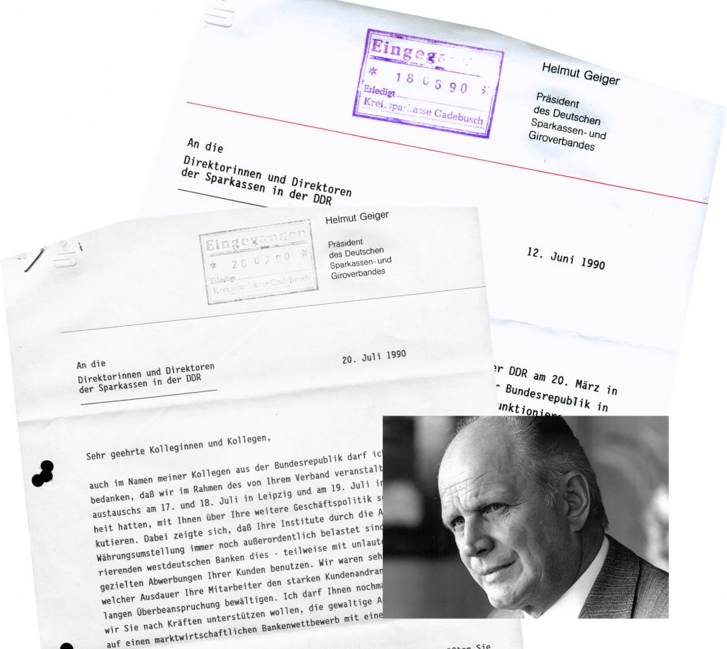 Geiger schreibt am 20. Juli 1990 anerkennend: „Wir waren sehr beeindruckt, mit welcher Ausdauer Ihre Mitarbeiter den starken Kundenandrang trotz der monatelangen Überbeanspruchung bewältigen.“ Er bekräftigt die westdeutsche Unterstützung bei der „gewaltigen Aufgabe der Umstellung auf einen marktwirtschaftlichen Bankenwettbewerb mit einer neuen Währung.“ Leider müsse man nun aber auch damit rechnen, „daß alle westdeutschen Banken ihre Marktanstrengungen noch weiter verstärken und dabei gezielt die derzeitige Überlastung der Sparkassen ausnutzen werden.“*
