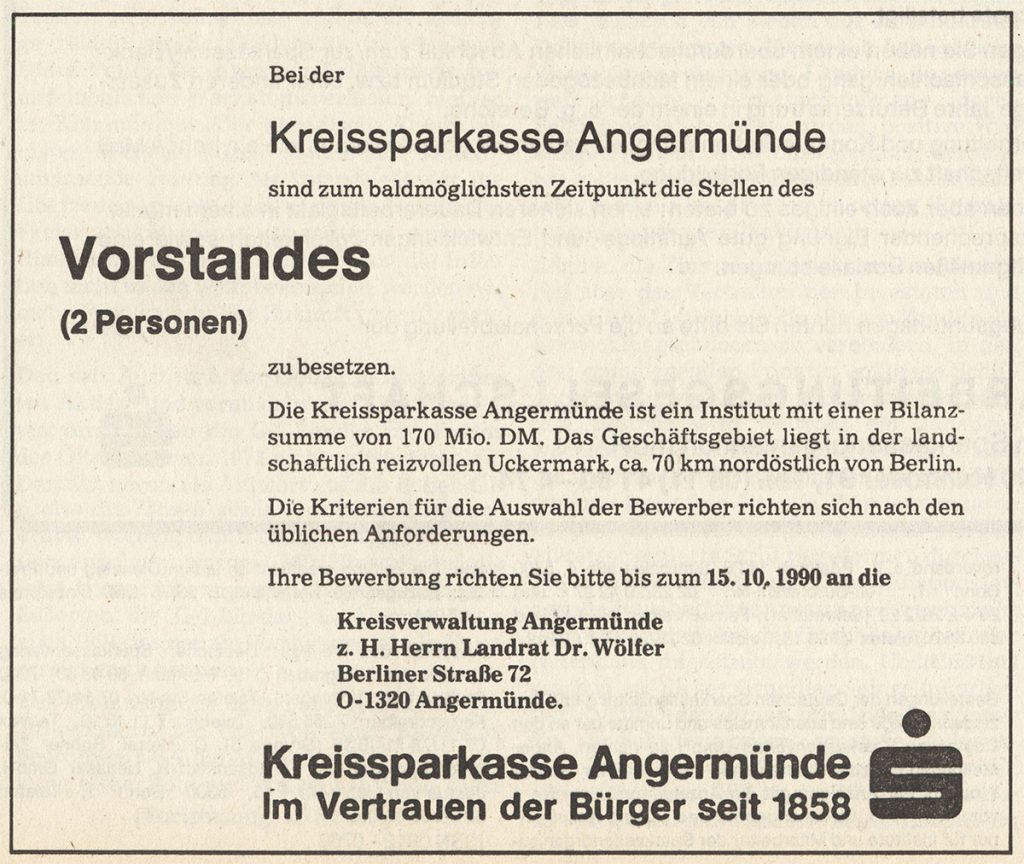 Ab dem 17. August 1990 wurden sie in der Deutschen Sparkassenzeitung veröffentlicht, die Anzeigen, mit denen die DDR-Sparkassen geeignetes Personal zur Besetzung der Vorstandspositionen suchten.* Meist war ein Zwei-Personen-Vorstand vorgesehen. Die Vorstandsverfassung nach dem Kreditwesengesetz (KWG) erforderte mindestens zwei Vorstände je Sparkasse, um das Vier-Augen-Prinzip zu gewährleisten.** Hunderte Leitungsstellen waren damals zu besetzen. Dies stellte eine gigantische Aufgabe dar, welche für die ostdeutschen Sparkassen auch eine existenzielle Bedeutung hatte. „Wenn es nämlich nicht gelingt, gute Führungskräfte zu identifizieren und zu bestellen, dann ist der Verlust der Marktführerschaft in allen Marktsegmenten vorgezeichnet.“ *** Zuständig für die Bestellungen waren gemäß DDR-Sparkassengesetz die Verwaltungsräte der Sparkassen, die erst gebildet werden mussten. Da aber feststand, wer die Verwaltungsratsvorsitzenden sein sollten, nämlich die Landräte oder Oberbürgermeister, konnten bereits Stellen von ihnen ausgeschrieben werden. Das Wissen nicht nur zur Wahl der Verwaltungsräte und zur Bestellung der Vorstände bekamen sie bei Informationsseminaren vermittelt, die vom 21. bis zum 25. August 1990 in Berlin stattfanden.