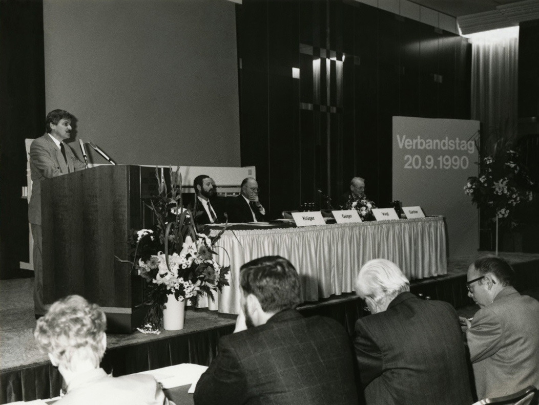 176 Direktorinnen und Direktoren folgten der Einladung des Präsidenten des Sparkassenverbandes der DDR vom 3. September 1990 und kamen vor 30 Jahren ins Hotel Inter-Continental in der Budapester Straße im Westteil Berlins. Weil in Anbetracht des Vereinigungsprozesses eine Änderung der Satzung notwendig war, fand dort ein außerordentlicher Verbandstag statt.* Am 14. September hatte der Vorläufige Verbandsrat eine wichtige Vorlage für die Versammlung ausgearbeitet, welche dann als Beschluss Nr. 8/1990 realisiert wurde. Sie betraf auch eine Namensänderung.