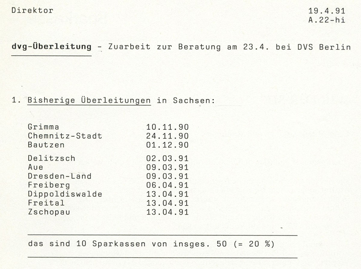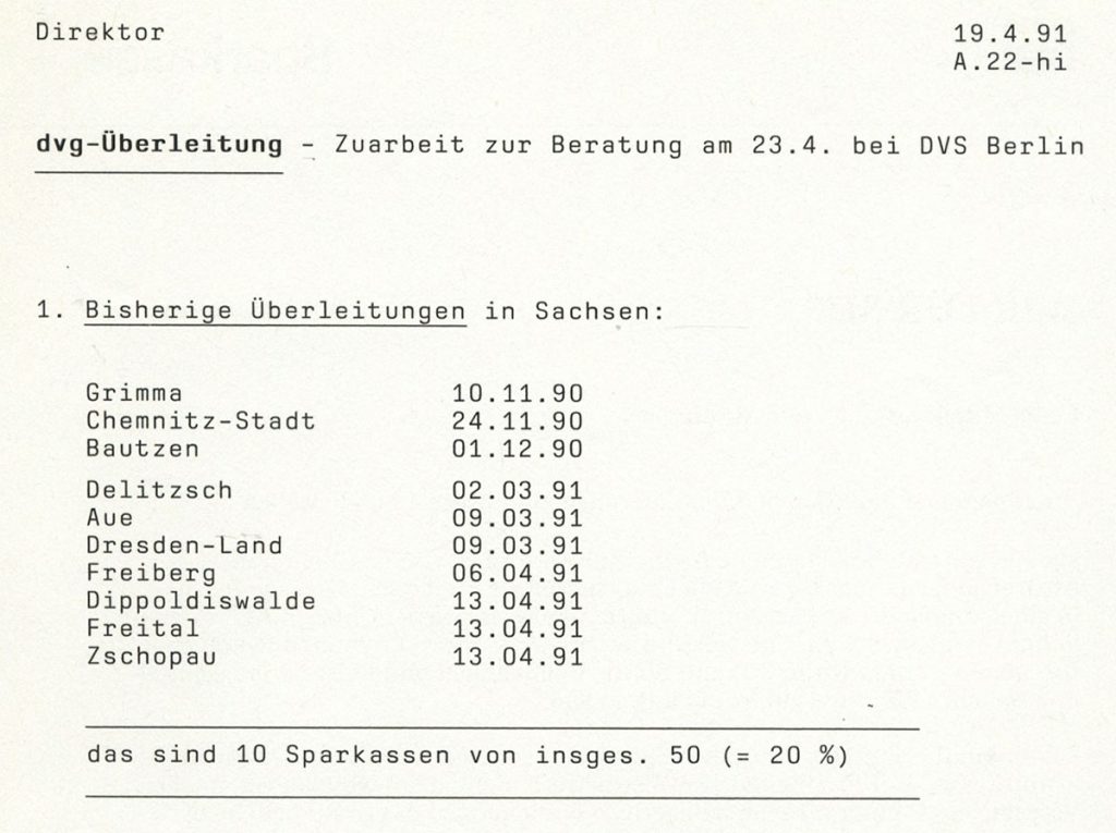 Die erste Überleitung gab es am 6. Oktober 1990 bei der Kreis- und Stadtsparkasse Suhl. Da Leipzig noch nicht einsatzbereit war, wurde die Sparkasse über einen Test- und Reserveserver der dvg in Braunschweig übergeleitet.***** Die Datenbestände verlagerte man später nach Leipzig, so auch die der Kreissparkasse Grimma, die am 10. November 1990 umgestellt wurde. Über das dvs-Rechenzentrum in Berlin fand am 17. November die Kreissparkasse Neustrelitz und am 1. Dezember die Stadtsparkasse Magdeburg Anschluss. Die erste Überleitung in Brandenburg fand am 9. Februar 1991 bei der Stadt- und Kreissparkasse Cottbus statt. Da waren die Pilotierungen schon abgeschlossen. Insgesamt konnten bis zum 30. November 1991 planmäßig sämtliche Sparkassen übergeleitet werden. Als letztes war die Kreissparkasse Zerbst an der Reihe. Damit war aber nur die erste Phase des Überleitungsprozesses beendet und ein einheitlicher Zahlungsverkehr sichergestellt.
