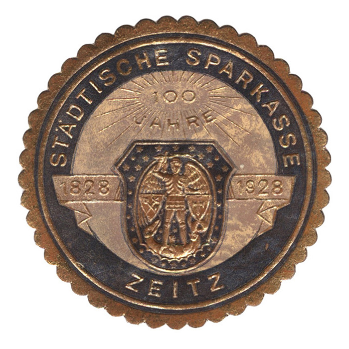 • Siegelmarke der Sparkasse mit Stadtwappen zum 100. Jubiläum : © Historisches Archiv des OSV