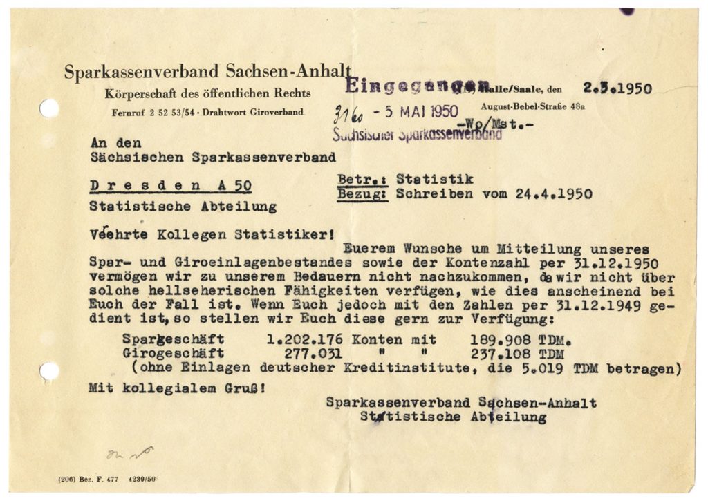 Verwundert zeigten sich die für die Statistik zuständigen Mitarbeiter des Sparkassenverbandes in Halle. Was war das denn? Konnten die verehrten Kollegen in Dresden etwa hellsehen? Der Sächsische Sparkassenverband hatte sich doch tatsächlich im Jahr vertan, als er am 24. April 1950 seine Daten übermittelte und um die der Nachbarn in Sachsen-Anhalt bat. Was die Ursache dieses Fehlers war, darüber können wir heute nur spekulieren. Und vielleicht kann man auch über die Reaktion der Verbandsmitarbeiter schmunzeln. Das Schriftstück ist, wie zahlreiche anderen Quellen zur Sparkassengeschichte, in unserem Archivbestand erhalten. Er erlaubt zum Beispiel einen Blick in die Zeit, als noch Sparkassenverbände in der DDR existierten. Aus den Unterlagen geht übrigens hervor, dass Sachsen im Spargeschäft 1949 weit vor den anderen Ländern rangierte.