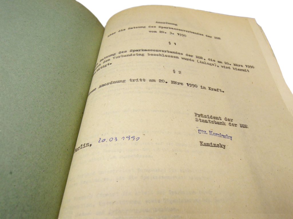 […] Die sich gegenwärtig mit hohem Tempo vollziehende Entwicklung in den Beziehungen zwischen der DDR und der BRD, insbesondere auch auf dem Gebiet der Währungspolitik (einschließlich der damit verbundenen offenen Fragen), lassen es zum gegenwärtigen Zeitpunkt nicht zweckmäßig erscheinen, über die Bildung eines Sparkassenverbandes und den Inhalt seiner Satzung zu befinden […]*****